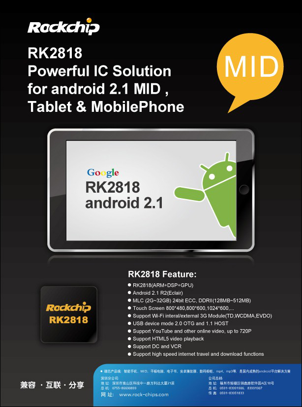 瑞芯微電子在本屆通信展發(fā)布了基于RK2818平臺(tái)的3G移動(dòng)互聯(lián)方案,領(lǐng)創(chuàng)智能平板電腦的中國芯崛起。