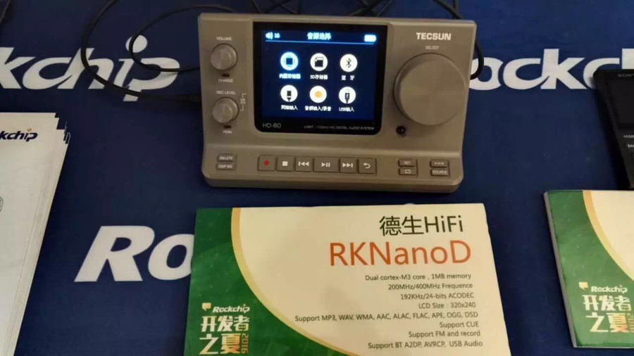 現(xiàn)場展示了多款搭載RKNanoD的音響設備,具備七大特點:好聲音(>100dB SNR)、真HiFi(24bit 192Khz)、低功耗(8mA MP3播放)、高性能雙核M3、大容量1MB SRAM、無線連接、FreeRTOS。