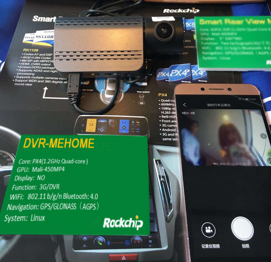 Rockchip高階PX4車聯網方案,四核處理器,Mali-450GPU,助力車聯網產品全面升級。本次展出了搭載PX4方案的行車記錄儀,基于Linux系統,支持前后1080P+720P雙錄、網絡在線直播、Wifi無線透傳,時延200ms內、BT4.0抓拍按鍵、GPS軌跡追蹤、優秀的功耗控制;可通過手機APP觀看實時或錄制影像。