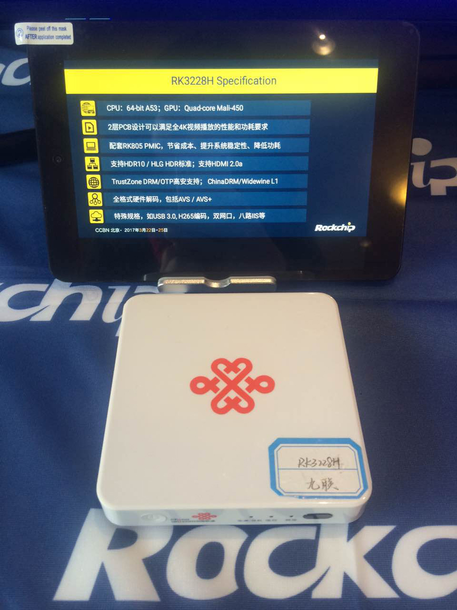Rockchip在CCBN2017展出搭載四核超優性價比的機頂盒芯片產品RK3228B以及高性能的機頂盒芯片產品3228H。方案亮點涵蓋:
