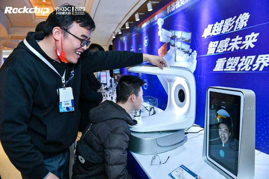 在機器視覺展區,展出了多款基于瑞芯微機器視覺方案RV1103/RV1106/RV1108/RV1109/RV1126的前端及后端應用,涵蓋IPC、門禁閘機、智能門鎖、3D結構光模組、車載影像等,采用一系列瑞芯微自研技術包括星光ISP、智能算法、低功耗快啟、智能壓縮編碼、雙目融合拼接、數字防抖等。