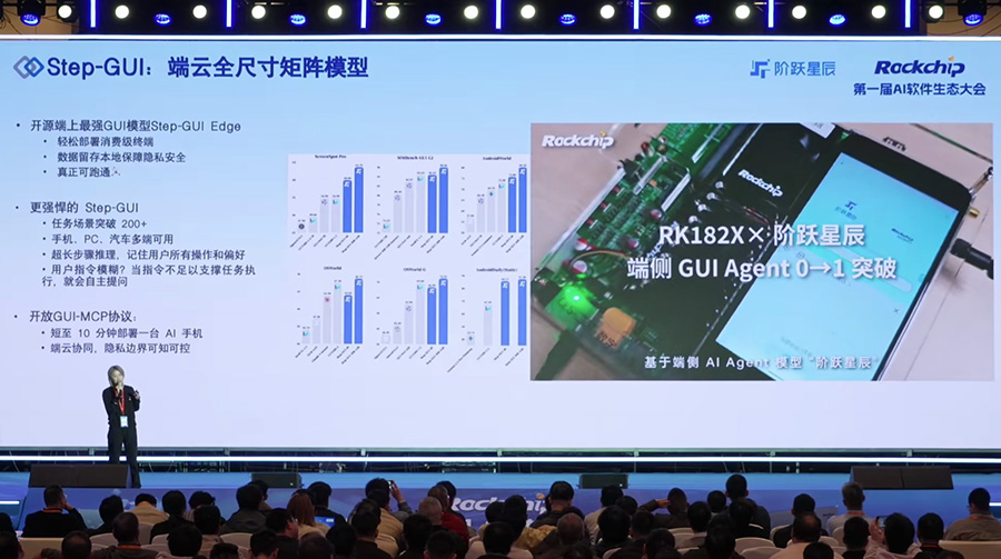 陶永亮先生介紹了通義千問大模型通過輕量化技術實現端側高效部署的實踐,瑞芯微作為主要芯片合作伙伴,從計算圖和算子層面優化性能,為共同客戶提供極致模型運行能效。張洵愷先生提出了極具前瞻性的“For-Device”理念,強調為終端場景原生設計大模型,并展示了GLM系列在RK182X平臺上的深度適配成果;梁丹洵女士通過展示一系列基于“芯片+模型”的智能體解決方案,進一步將端側AI趨勢推向應用層, 基于RK182X+階躍自研Step-GUI系列模型生動展現了端側AI如何實現跨系統自主操作,重新定義人機交互邊界,更發起了瑞芯微-階躍 Rockchip-Stepfun AI軟件生態支持計劃,為個人開發者、企業開發者提供支持。